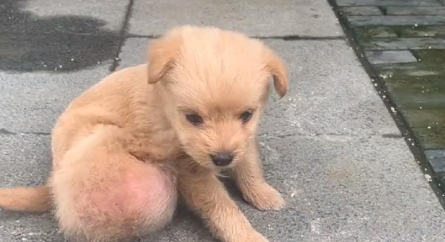 长了巨大肿瘤的流浪小奶狗无辜的蹲在路边